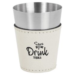 This 2oz. white stainless steel & leatherette shot glass makes the perfect adult gift. Great product for bars, clubs, and restaurants. Leatherette offers the look and feel of genuine leather at a fraction of the price. This richly textured, synthetic material is water resistant, easy to clean, and durable enough for the rigors of daily use. This product is laser engraved leaving an elegant, black imprint on the leatherette.